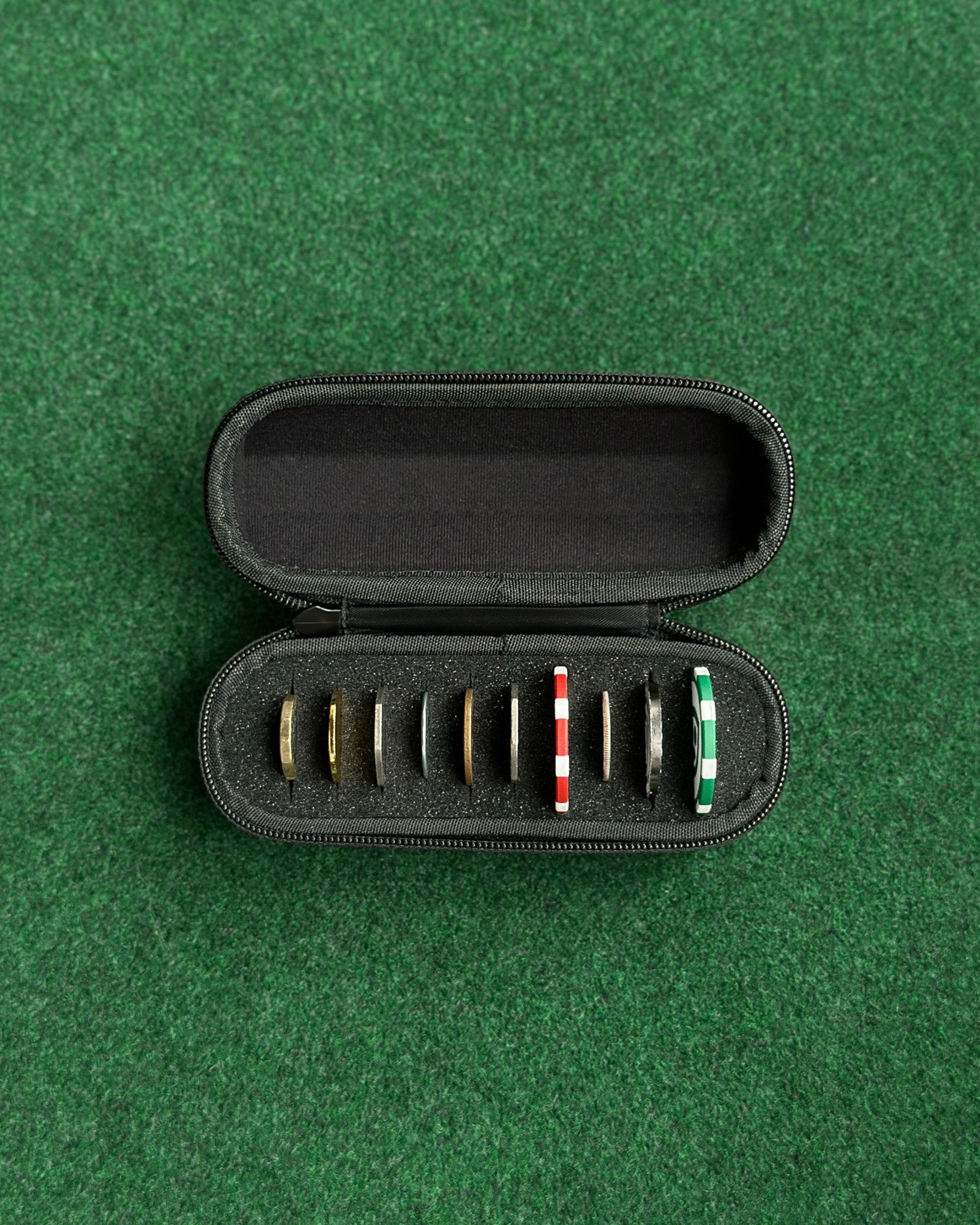- Fits up to ten golf ball markers, each up to the diameter of a poker chip.